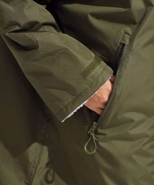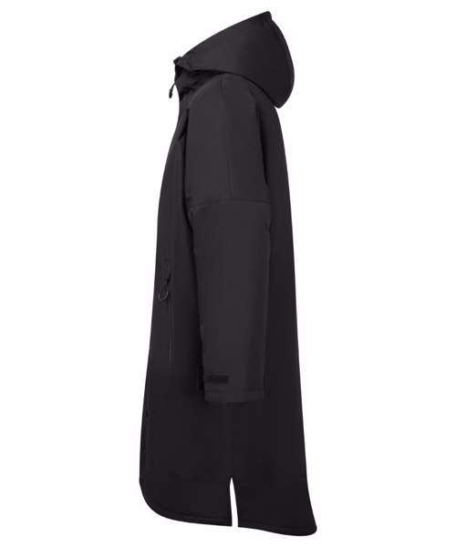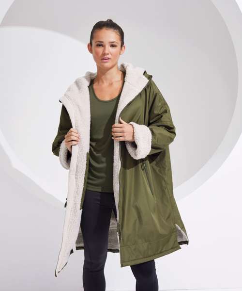 Unisex. Oversized. Full-length two-way plastic zip with easy pull toggles. Chin guard. Oversized fit. Side vents. Adjustable cuffs with hook and loop fastening. Side zip pockets. Inside pocket with zip on the left side. Inside patch pocket on the right side. 3-panelled hood. Loop on the centre back of the jacket for hanging the robe. Dropped back hemline. (5000/5000 waterproof and windproof). Embroidery access to the back and chest area can be accessed through here. Waterproof taped seamed outer layer. Sherpa fleece interior. Rebrandable stuff sack carry bag with double drawstring straps. CE Class 1 Certified.